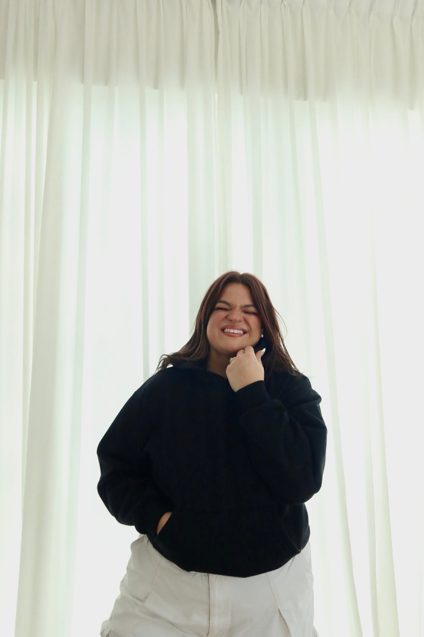 10 oz oversized hoodie, wide voluminous fit, features a kangaroo pocket and matching rib cuffs and waistband. 2-end fleece made of a 50/50 blend of poly-cotton, tight-knit with minimal stretch.