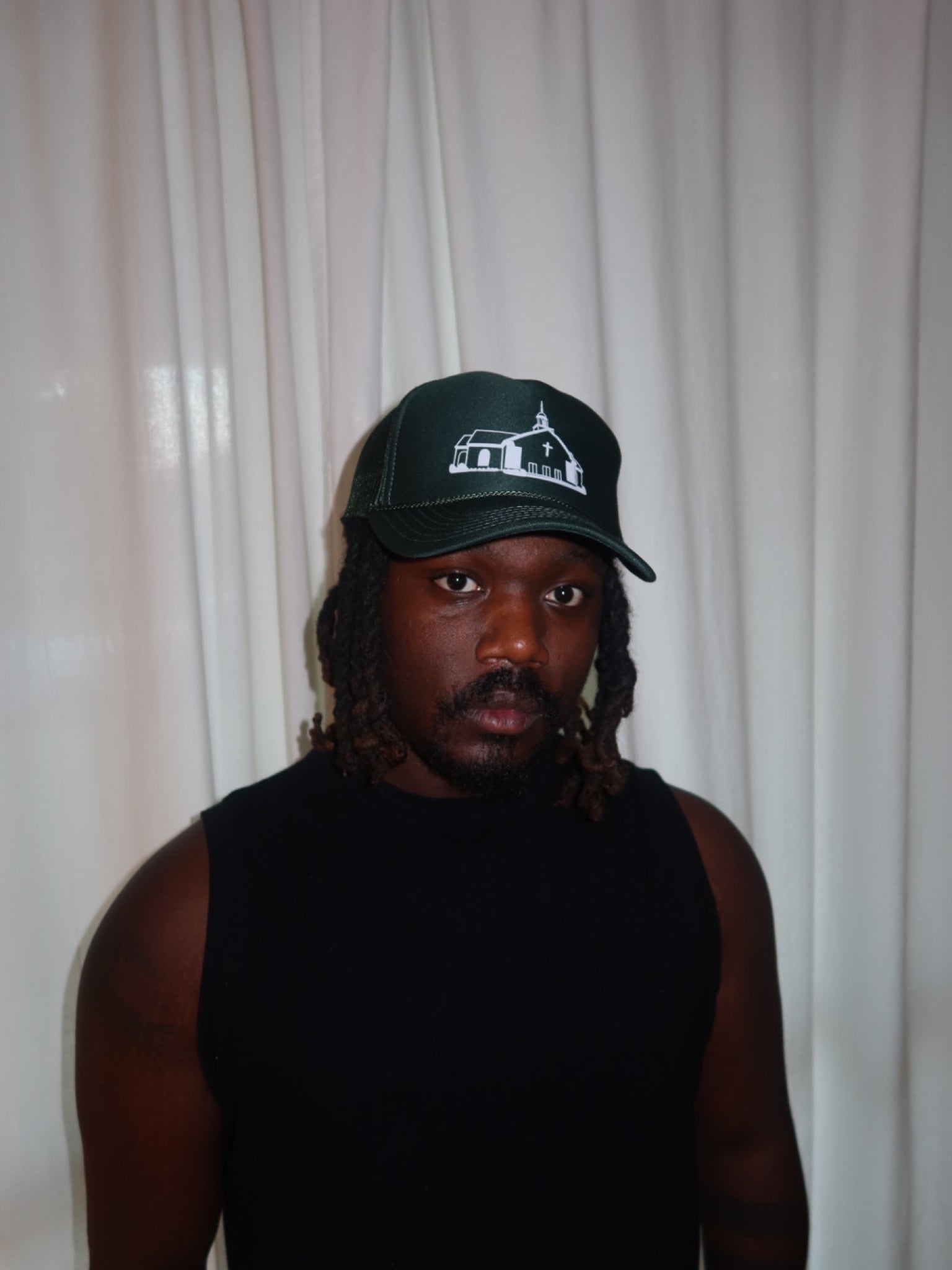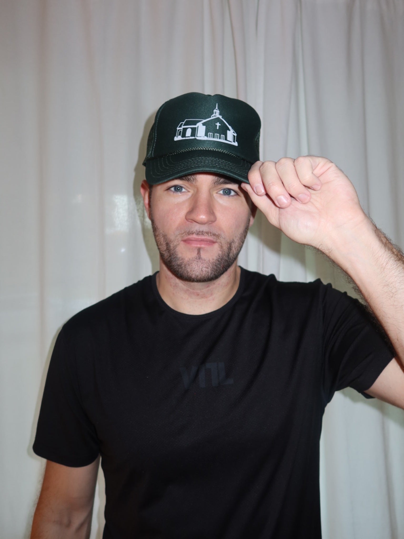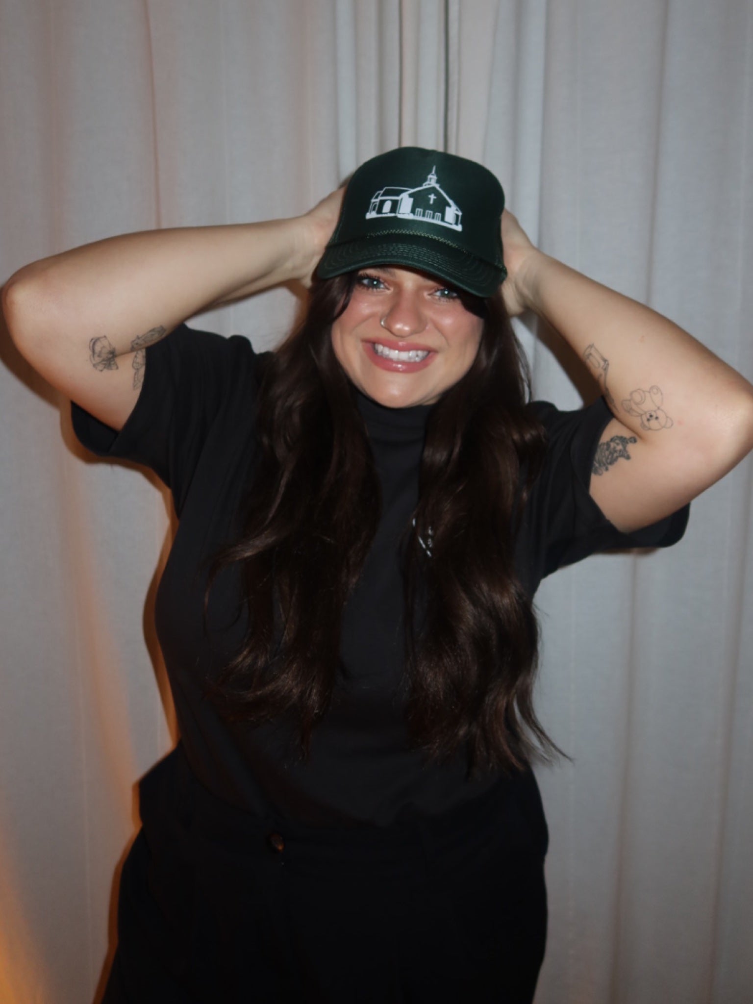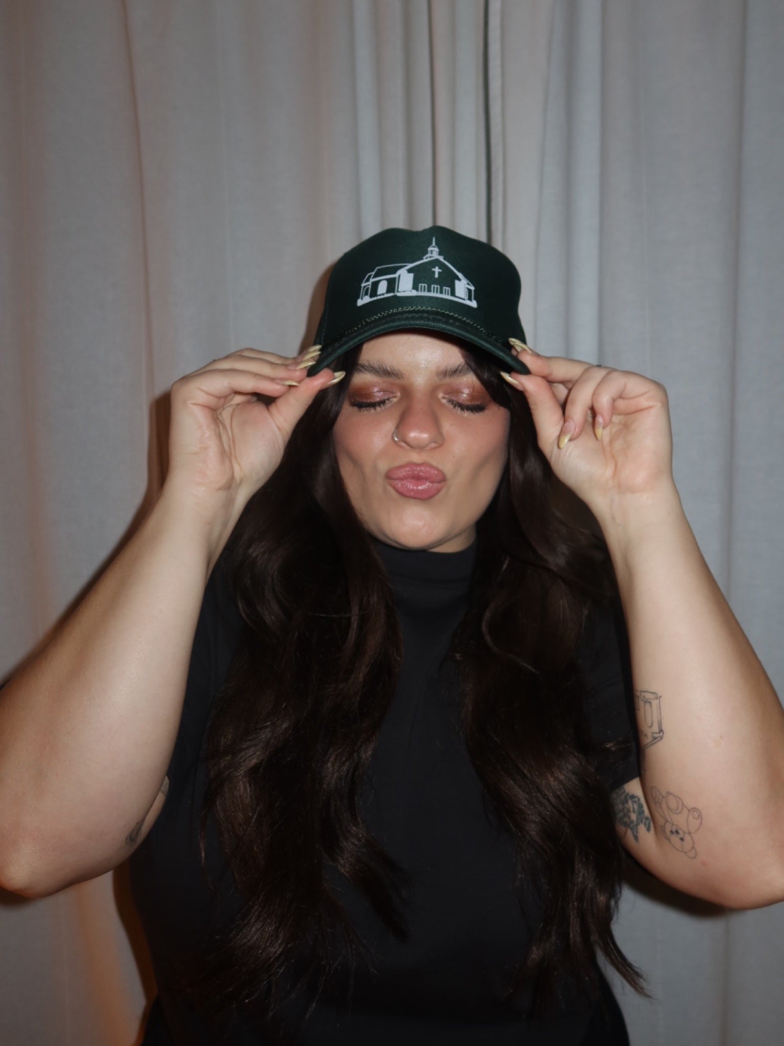 Forrest green, 5 panel high crown mesh back trucker hat.